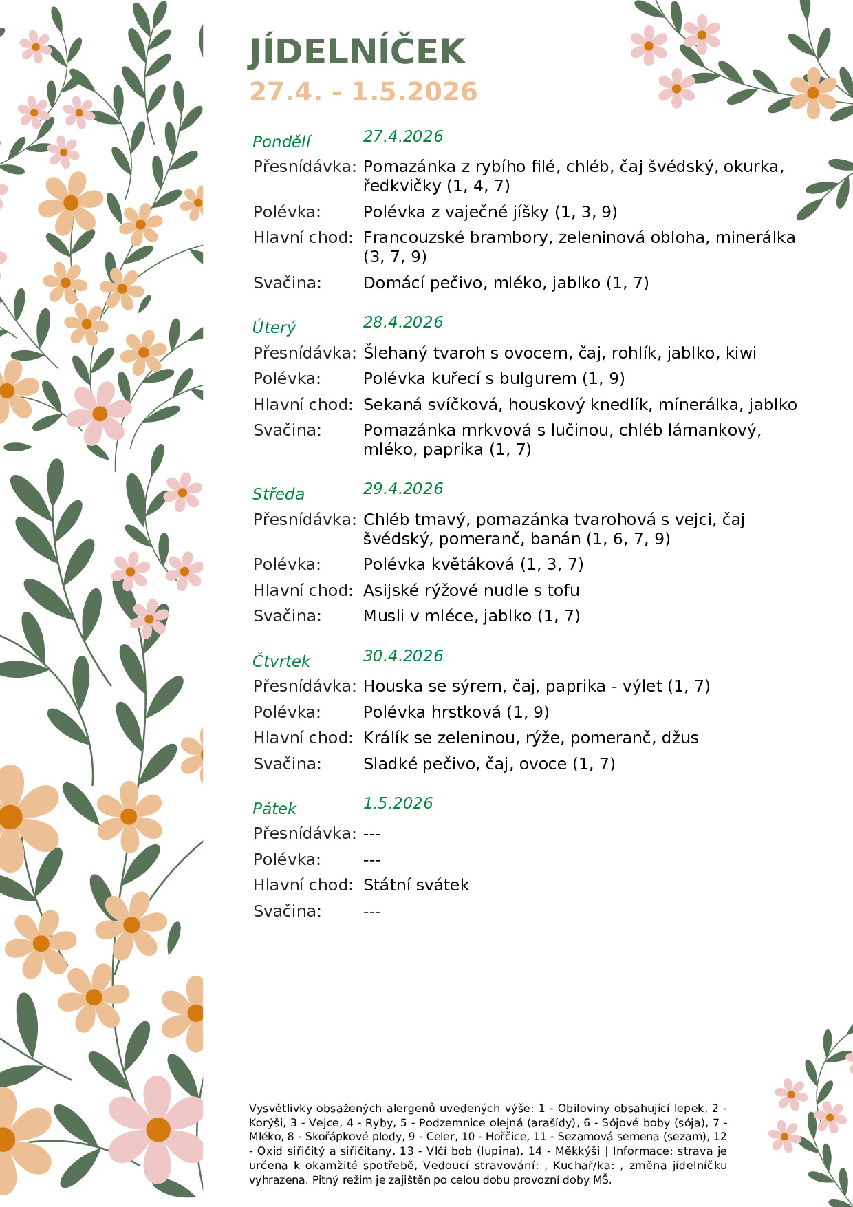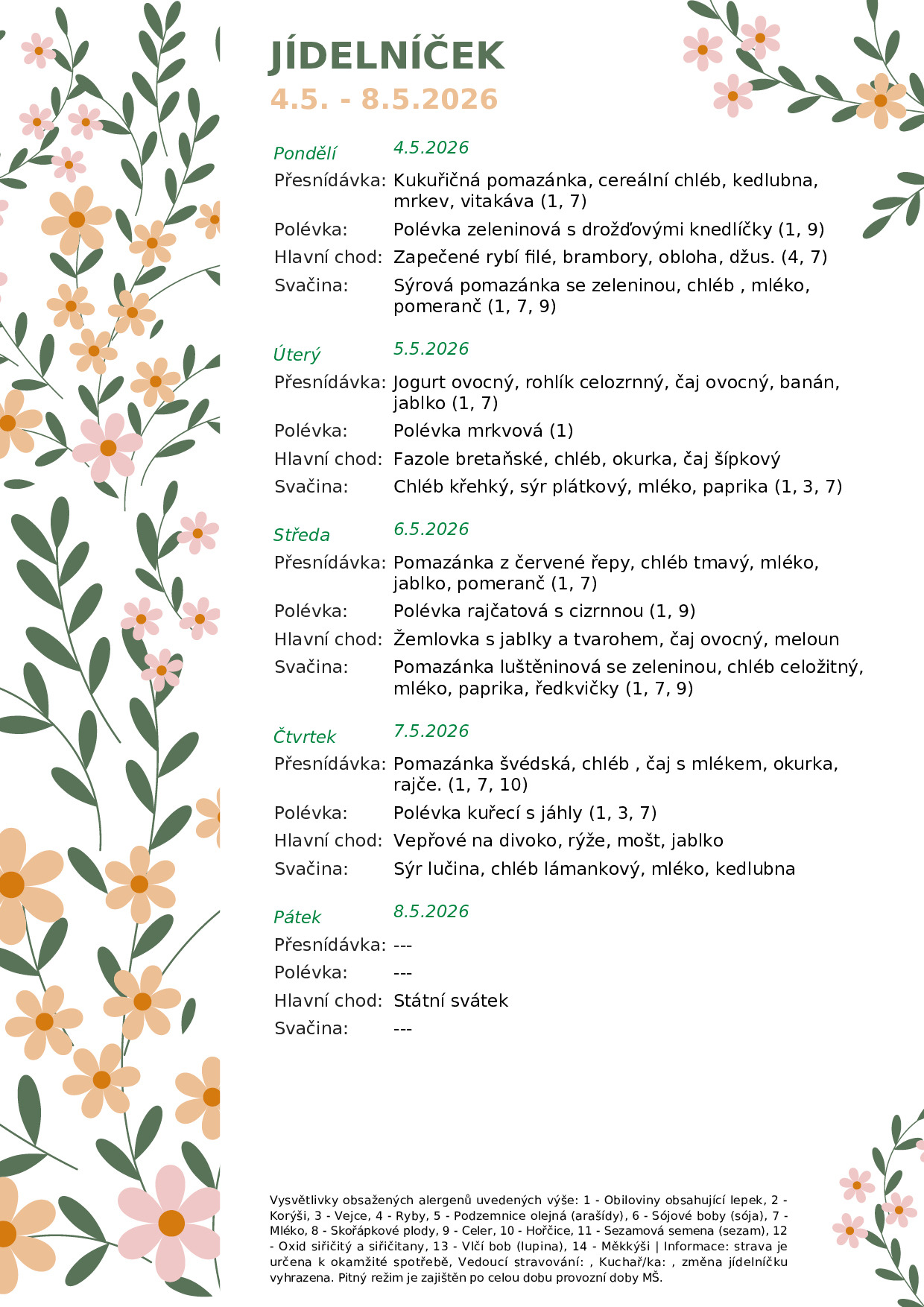 V této sekci najdete aktuální jídelníček a přehled alergenů. Dětem nabízíme pestrou a vyváženou stravu dle zásad zdravého stravování. Jídelníček pravidelně aktualizujeme a uvádíme i seznam obsažených alergenů podle platné legislativy.