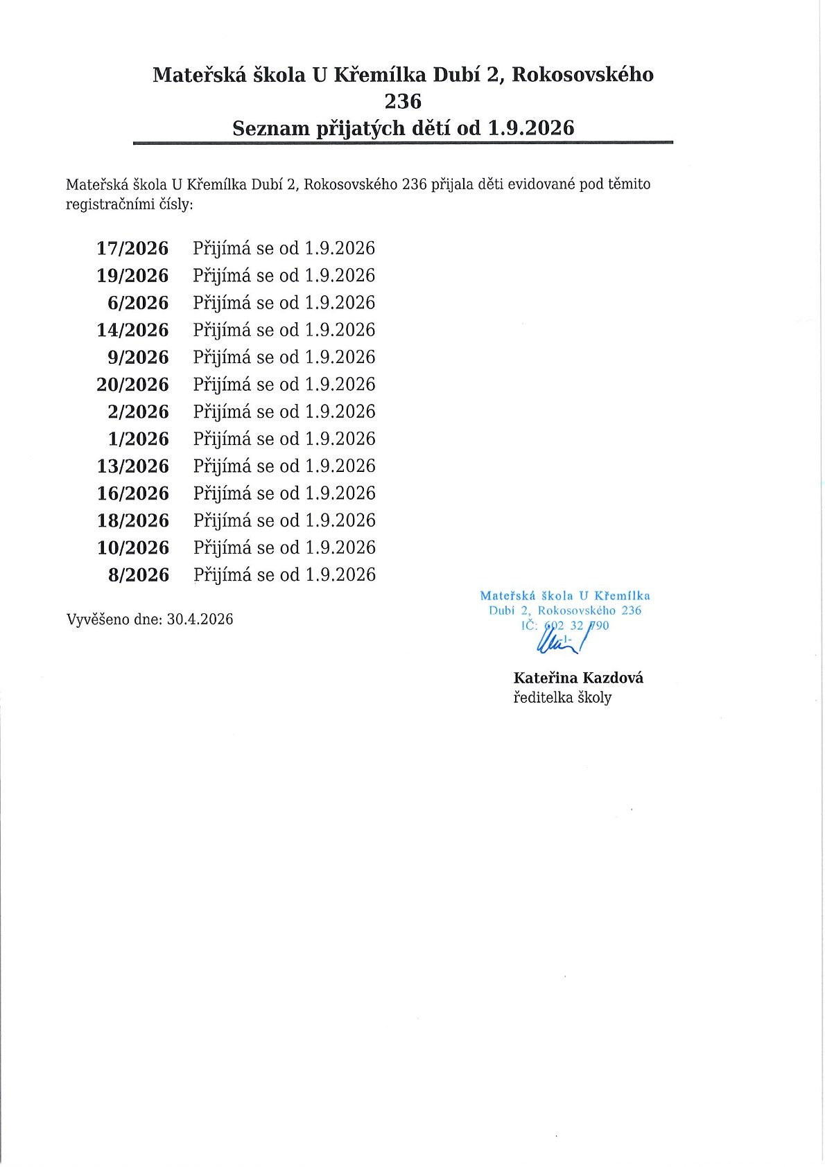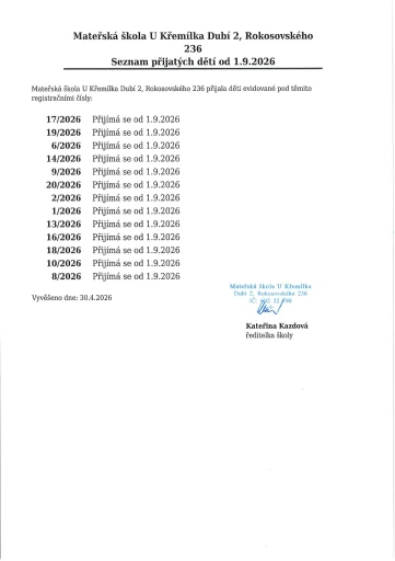 Zde najdete veškeré důležité informace týkající se zápisu dětí do mateřské školy pro školní rok 2026/2027. V přílohách najdete informace k termínu a průběhu zápisu, formulář Žádosti o přijetí včetně vyjádření dětského lékaře, Kritéria pro přijímání dětí k předškolnímu vzdělávání a vyhlášku Města Dubí stanovující spádovost dětí do mateřských škol. Od 23.3.2026 do 7.4.2026 bude na tomto místě zpřístupněn odkaz k elektronickému předzápisu, ve kterém se budou moci zákonní zástupci zaregistrovat, vyplnit potřebné údaje dítěte a zarezervovat si čas v den zápisu.