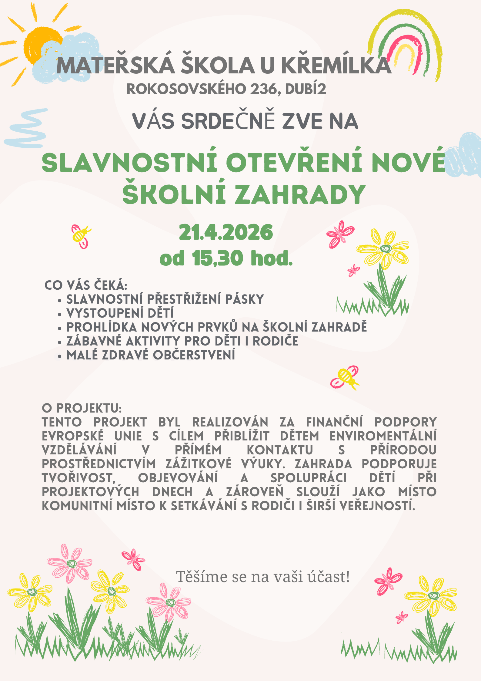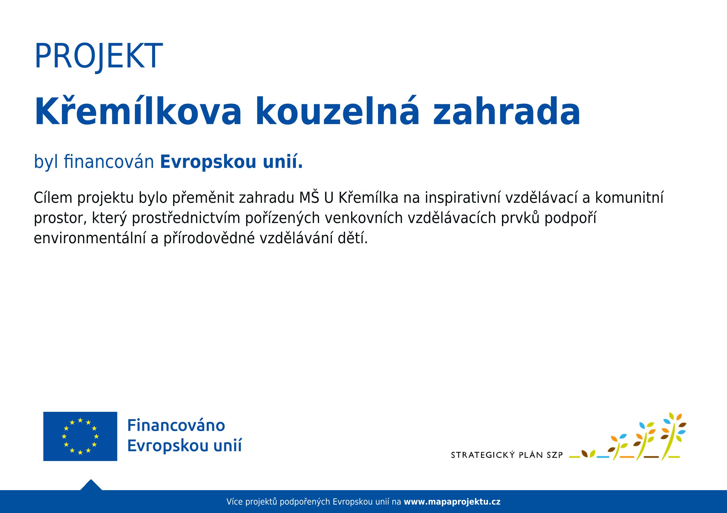 Naše mateřská škola v průběhu měsíce března úspěšně dokončila projekt Křemílkova kouzelná zahrada, jehož cílem byla modernizace školní zahrady a vytvoření inspirativního prostoru pro venkovní vzdělávání i komunitní setkávání. Projekt byl realizován s podporou MAS Cínovecko o.p.s. v rámci Strategického plánu Společné zemědělské politiky.