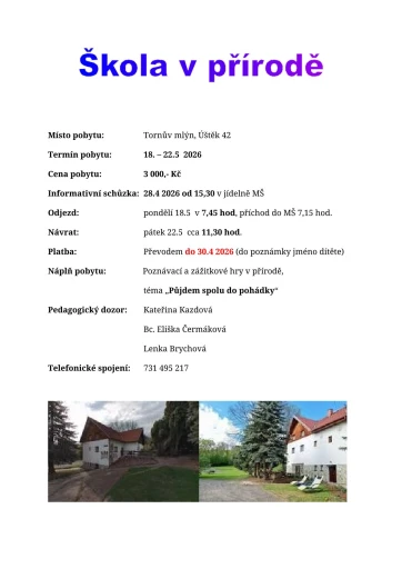 Letošní škola v přírodě proběhne v termínu od pondělí 18.5. do pátku 22.5.2026 v penzionu Tornův mlýn ve Starém Týnu, nedaleko města Úštěk. Tentokrát se společně s dětmi vydáme do pohádek. V úterý 28.4.2026 od 15,30 hod. je plánována v prostorách mateřské školy informativní schůzka pro rodiče, týkající se informací k odjezdu. Bližší informace k platbě školy v přírodě najdete v přiloženém letáku.